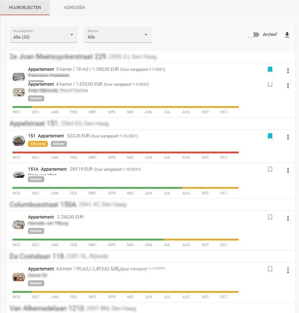 Eindelijk het overzicht van huurobjecten zoals je het wilde. Met - onder meer - de actuele huurder en de looptijd van het huurcontract. Maar ook een melding als er onbetaalde nota’s zijn.